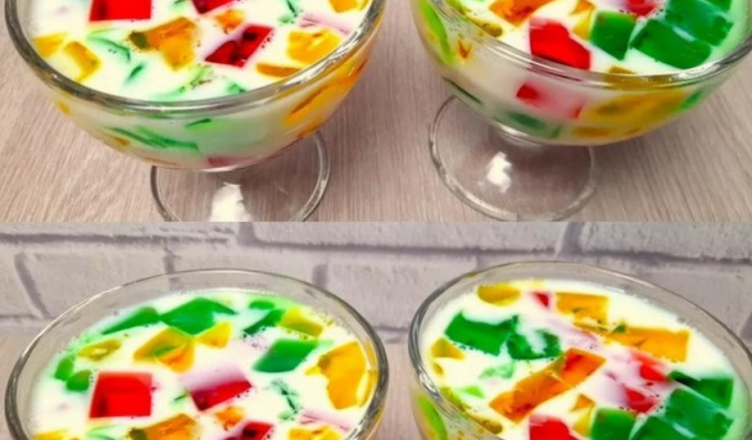 Яскраві шматочки желе, залиті ніжною молочною масою, виглядають ефектно, а смак