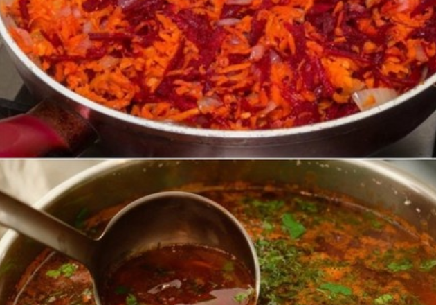 Їхній підхід простий — вони просто очищають буряк і відправляють його цілком у бульйон. Потім вони витягують буряк і м’ясо з каструлі, проціджують бульйон, що вийшов. Тільки за 10 хвилин до закінчення готування вони додають буряк натертий у борщ. Вогонь вимикається, як тільки борщ закипить. Спробуйте зробити так само, і ви побачите, який чарівний колір набуде ваш борщ.