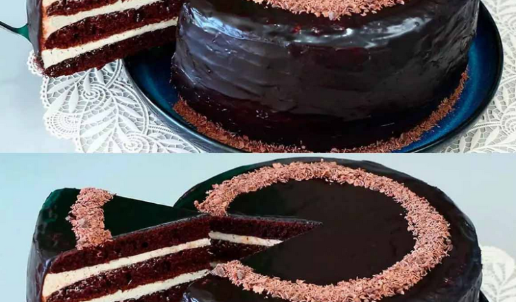 Дістаю торт із холодильника, знімаю плівку й обмазую боки відкладеним кремом. Потім заливаю глазур’ю — спочатку по краях, а далі по всій поверхні. Розрівнюю ложкою або лопаткою й посипаю тертим шоколадом. Ставлю торт у холодильник ще на 15 хвилин, щоб глазур застигла.