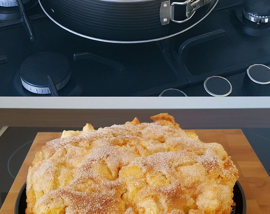 Спочатку замісіть тісто з маргарину або вершкового масла, цукру, яєць, розпушувача та борошна. Наріжте яблука великими шматочками (наприклад, на восьмі частини, залежно від розміру яблук) та змішайте їх з тістом. Перекладіть все у змащену маслом рознімну форму та трохи розрівняйте (хоча це легше сказати, ніж зробити).2. Тепер випікайте в розігрітій духовці за температури 180°C на нижній полиці приблизно 1 годину. Через 45 хвилин рясно змастіть маслом і щедро посипте цукром або сумішшю цукру та кориці.