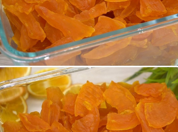 Готовність цукатів визначаємо за їх зовнішнім виглядом та липкістю – вони не повинні липнути до рук і склеюватись. Після вимкнення сушарки готові цукати перекладаємо в контейнер і щільно закриваємо кришкою. Зберігати їх слід у герметичній тарі, щоб запобігти попаданню вологи.