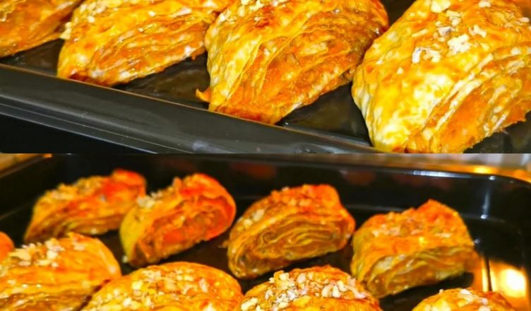 Викладіть рулетики на деко, застелене пергаментом, змастіть залишками намазки і випікайте у духовці 180°C 20–25 хвилин до рум’яної скоринки. Гарячі рулетики змастіть медом і посипте горіхами. Дайте трохи охолонути — і десерт готовий!