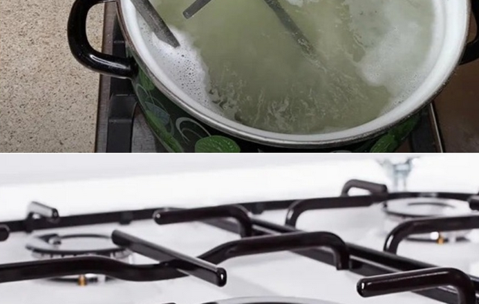Для початку потрібно взяти каструлю, в яку поміститися грати, наповнити її водою і поставити на вогонь. У воду додаємо дві таблетки для посудомийки. Вода повинна закипіти, після цього ставимо в каструлю грати і даємо воді кипіти ще близько півгодини.
