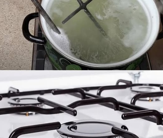 Для початку потрібно взяти каструлю, в яку поміститися грати, наповнити її водою і поставити на вогонь. У воду додаємо дві таблетки для посудомийки. Вода повинна закипіти, після цього ставимо в каструлю грати і даємо воді кипіти ще близько півгодини.