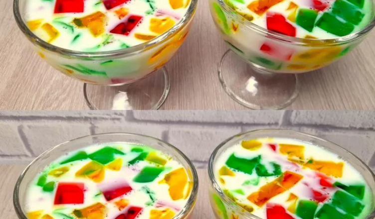 Яскраві шматочки желе, залиті ніжною молочною масою, виглядають ефектно, а смак