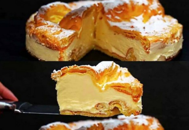 Перед подачею присипаю торт цукровою пудрою. Нарізаю порційними шматочками — вони виходять м’які, ніжні, крем буквально тане в роті. Цей торт дуже простий у приготуванні, а смак просто неймовірний. М’яке заварне тісто та ніжний крем роблять його схожим на великий еклер, тільки ще смачніший!