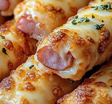 3. Сформуйте рулет у формі ромба та покладіть у центр скибочку шинки. Вставте одну паличку моцарели в центр шинки. Загорніть боки рулету в сир, потім згорніть весь рулет у рулет. Покладіть швом вниз на деко.