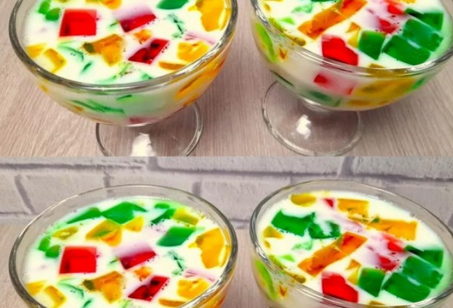 Яскраві шматочки желе, залиті ніжною молочною масою, виглядають ефектно, а смак
