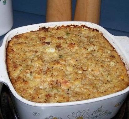 Розтопіть масло на сковороді на середньому вогні. 4 Обсмажте цибулю та селеру до розм’якшення (5–7 хв). 5 Додайте до кукурудзяного хліба. 6. Змішайте курячий бульйон, яйця, шавлію, сіль,