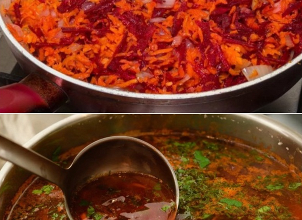 Їхній підхід простий — вони просто очищають буряк і відправляють його цілком у бульйон. Потім вони витягують буряк і м’ясо з каструлі, проціджують бульйон, що вийшов. Тільки за 10 хвилин до закінчення готування вони додають буряк натертий у борщ. Вогонь вимикається, як тільки борщ закипить. Спробуйте зробити так само, і ви побачите, який чарівний колір набуде ваш борщ.