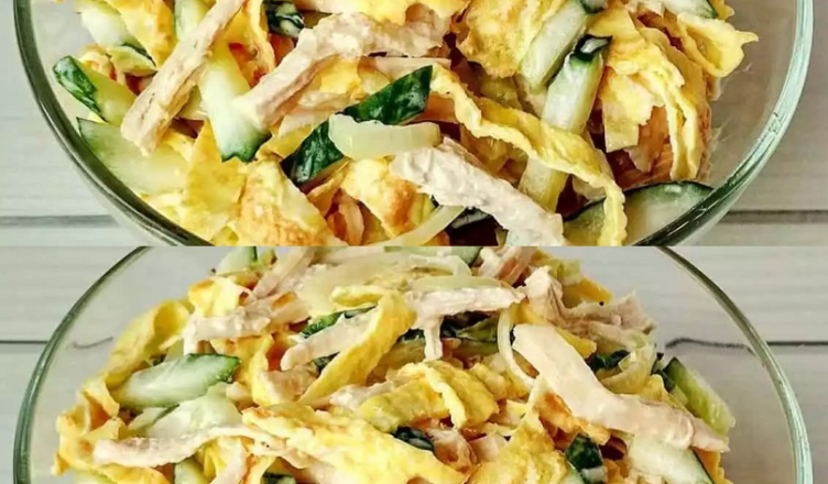 Нарізаю тонкими брусками свіжий огірок. Викладаю огірки та яєчну соломку у салатник. Відварену курячу грудку ділю на волокна. Нарізаю півкільцями цибулю, обсмажую в олії на сковороді до золотистості. Додаю цибулю, заправляю салат майонезом і перемішую.