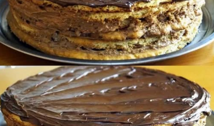 Збираю тортик, змащую усі коржики кремом. Прикрашаю розтопленим шоколадом, смачного!